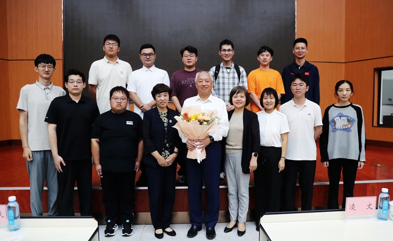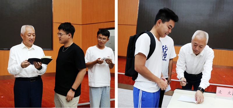 谭忆秋、张淑娣代表校区向凌文院士赠送了书籍《“八百壮士”今何在——我们时代的哈工大》和“威海壹号”卫星模型。(隗海燕 张玉芹 文/图)